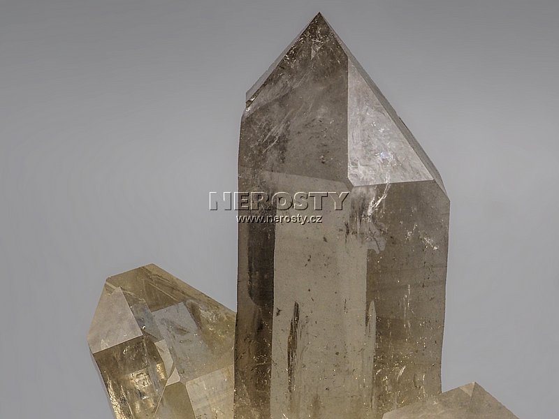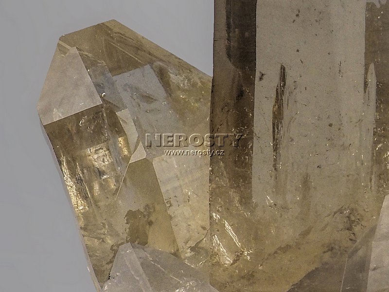 Ostře zakončené, dokonale čiré a silně lesklé citrínové krystaly jsou narostlé na podložce tvořené bílým krystalickým křemenem respektivě části většího krystalu. Delší z krystalů měří více než 9 cm. Krystaly nesou všechny charakteristické znaky jejich růstu.