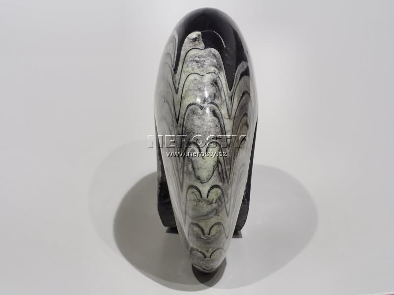 goniatit, leštěná fosílie, #9494:13440 Objednáváte konkrétní vyfotografovaný kus. Při objednání obdržíte přesně to, co vidíte na obrázku. Vzorek si můžete osobně prohlédnout v naší prodejní galerii. | |